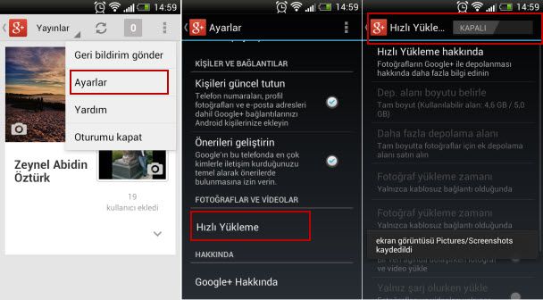 Instant Upload (Hızlı Yükleme): Bu özellik, çektiğiniz fotoğraf ve resimleri Google+ hesabınıza hızlı bir şekilde aktarmasını sağlar buda bataryanızdaki enerjiyi çabuk azaltır. Özellikle internet bağlantınız 3G ise, pil ve tüketim fazla etkilenir.